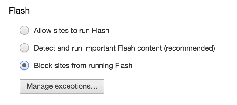 To enable flash for only certain websites, select Block sites from running Flash, and then click Manage exceptions. From here, enter the website’s address, choose Allow in the Behavior drop-down box, and click Done.