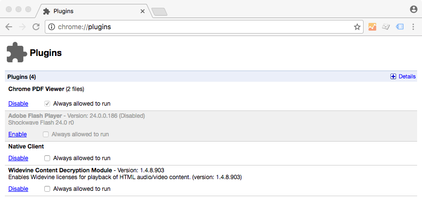 The Java plugin no longer works with recent versions of Google Chrome (since they dropped support for NPAPI plugins). To completely disable Adobe Flash in Google Chrome, navigate to the special page “chrome://plugins” in Chrome. Find the entry for Flash and click Disable.
